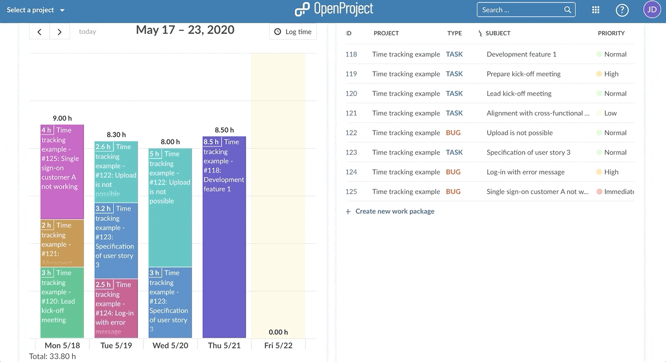 Tracking how much time you spent on work packages and quickly logging time on work packages is easy with OpenProject. My page shows you by week what time you have spent on which work packages. And from there you can directly log time to a work package by selecting the day you want to log time. Alternatively, you can log time in your work package table or in the work package detail view.