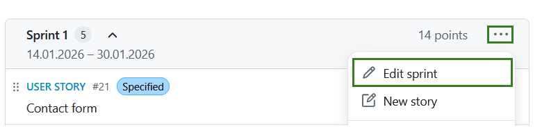 Moreover, you can adjust the start and end date of a backlog in the backlogs view. Click the More (three dots) icon to the right of the sprint name and select Edit sprint.